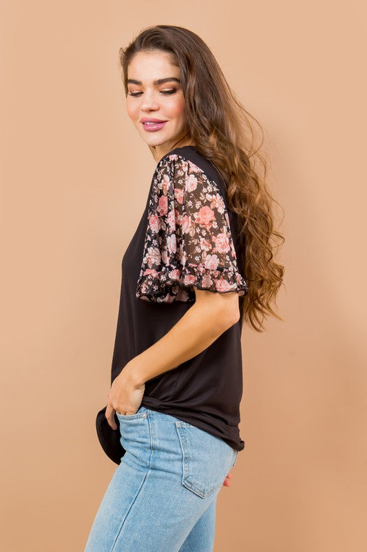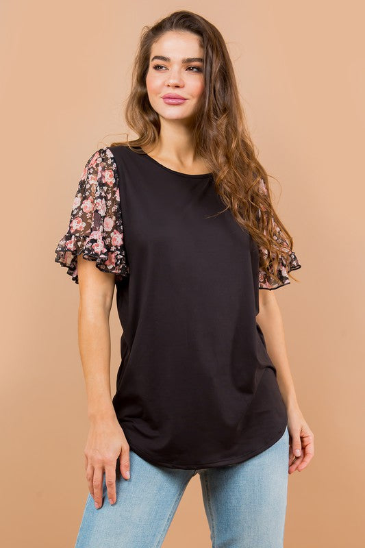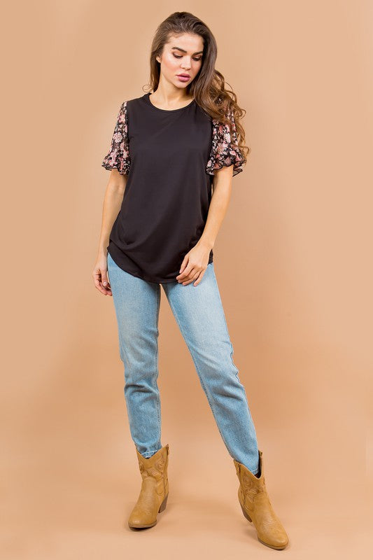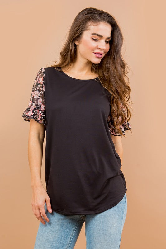 Knit jersey top with mesh ruffle detailed top